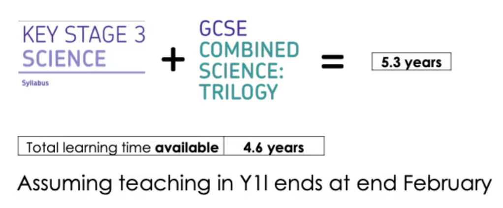 Reality can be stranger than fairy tales. We were commissioned by AQA to analyse how long it actually takes to teach all the Programme of Study (at 11-14) and GCSE (14-16). The time from year 7 to mid-way through year 11 is 4 1/2 years. However, we found that there is about 5 1/2 years worth of stuff to teach. That’s a cinderella problem. In case you’re wondering how we got these numbers, we based them on an average amount of curriculum time allocate to science, and the number of ‘big pieces’ – conceptual ideas and skills.