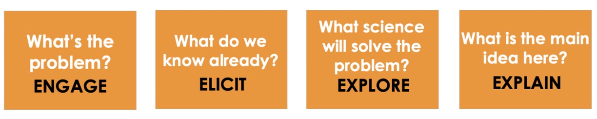 This leads to: ‘what do we know already’ and a pre-assessment activity to expose knowledge gaps and then fill them. The main part of the lesson is an exploration into the question: ‘What science will solve the problem?’ and a theoretical explanation that builds on students’ concrete experience.
